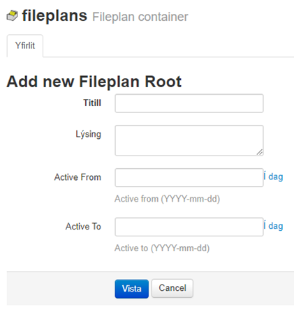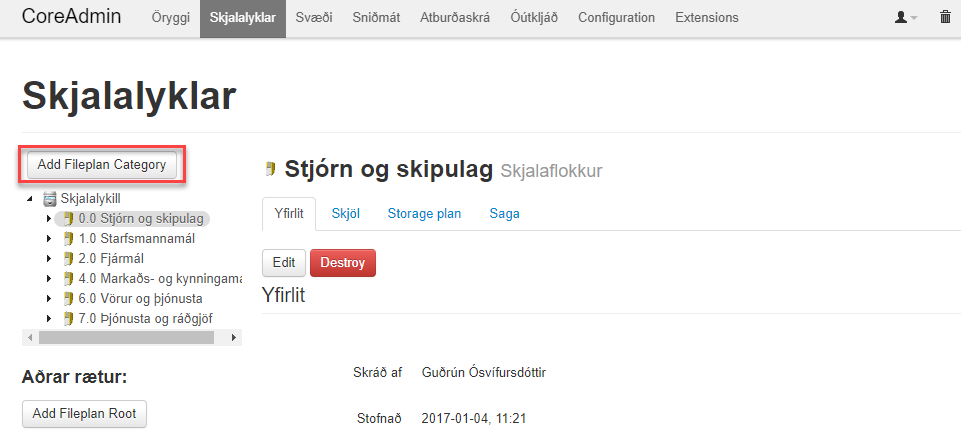Til að setja upp nýtt skjalaflokkunarkerfi, t.d. vegna gildistíma skjalalykla, er smellt á Add Fileplan Root.