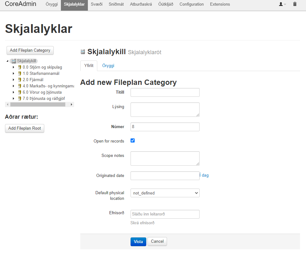 Skráðu upplýsingar um skjalaflokkinn þ.e. heiti, lýsingu/tilmæli og breyttu númeri ef þess þarf. Taktu eftir að fyrri hluti númer skjalaflokksins er dreginn af yfirflokknum (series). Þegar skráningin hefur verið vistuð verður flokkurinn sýnilegur í skjalaflokkunarkerfinu.