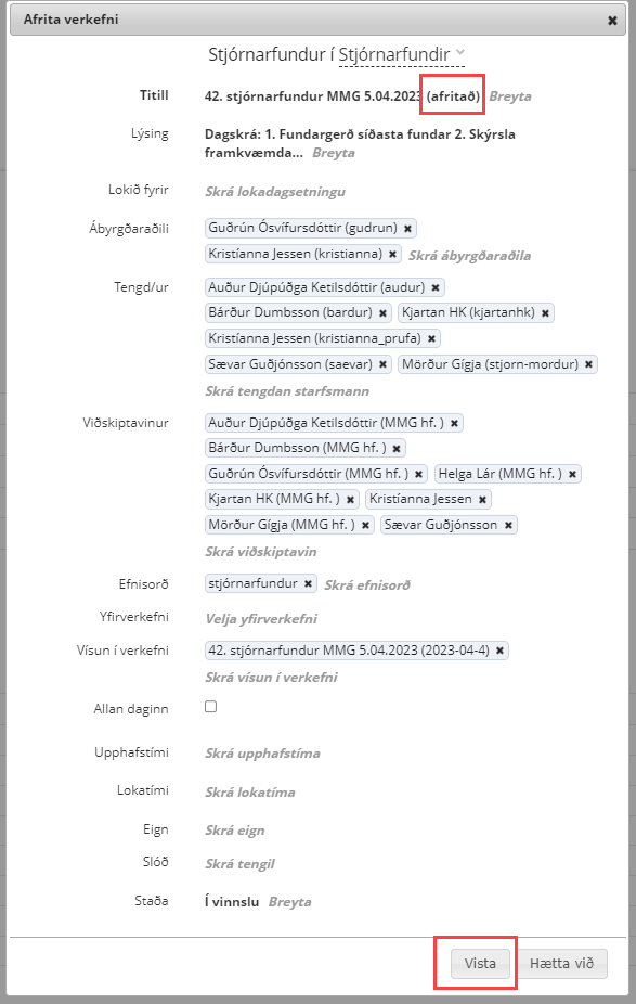 ATHUGIÐ að ef verkliðir eru skráðir á verkefnið þá afritast þeir einnig með í nýja verkefnið en engin skjöl fylgja með í afrituninni. Mögulega þarf að endurglæða síðuna til að fá verkliði inn í nýja verkefnið.