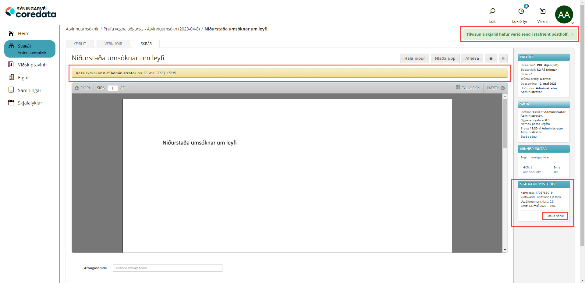 Notandi getur nú úr verkefni valið að senda ákveðið skjal í stafrænt pósthólf á einn eða fleiri viðtakendur.