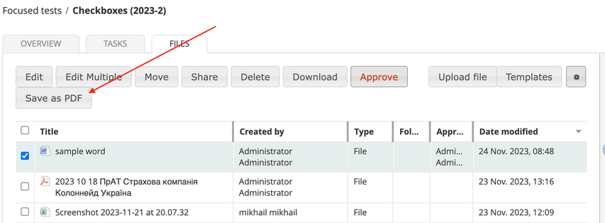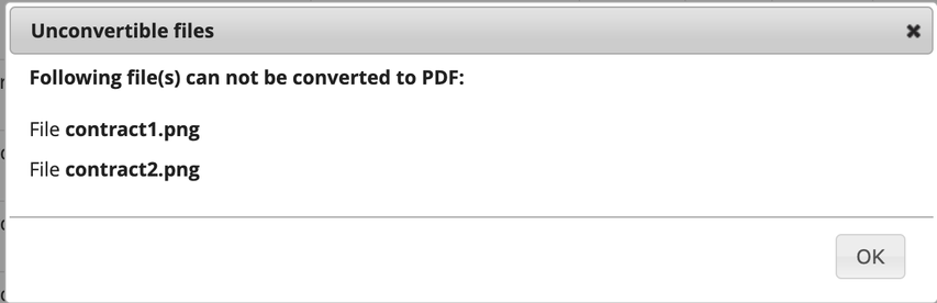 Ef valið er eitt eða fleiri skjöl sem ekki er á þessum umbreytanlegu skjalasniðum leysir aðgerðin það þannig að búið er til nýtt .pdf skjal fyrir umbreytanlegu skjölin en listuð eru upp þau skjöl sem ekki var hægt að búa til .pdf skjal úr.