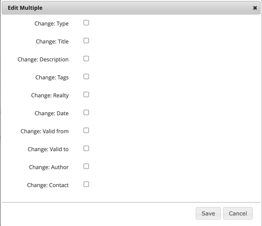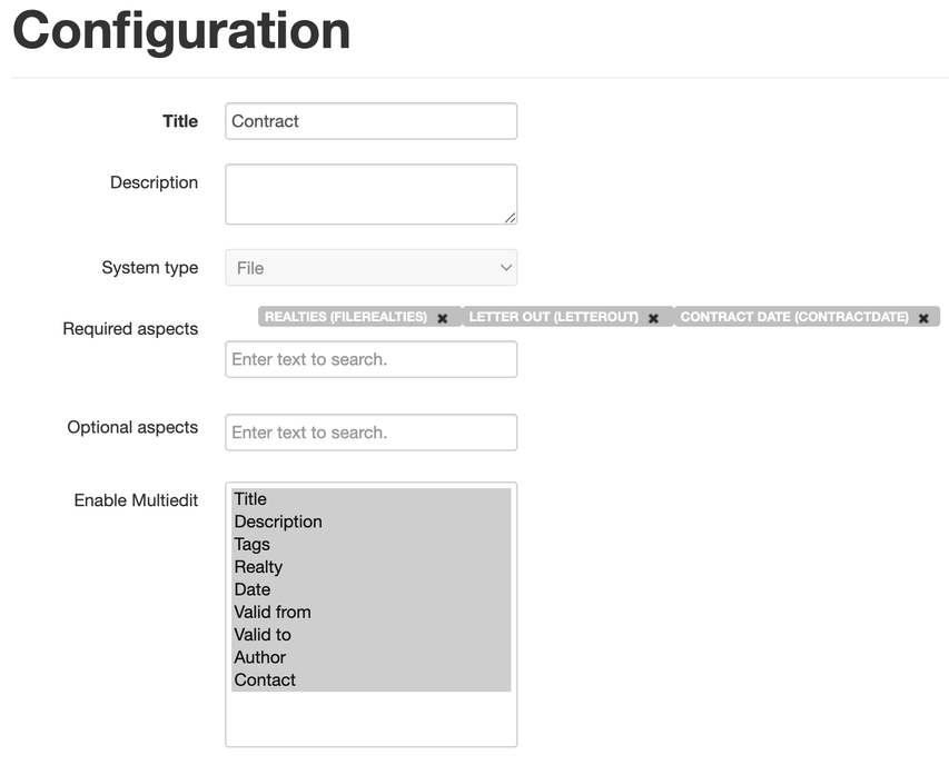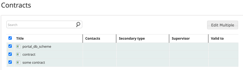 Bætt hefur verið við virkni til að breyta mörgum samningum í einu. Virknin er möguleg ef “Multi edit” extension er virkjuð. Þá er mögulegt að velja hvaða svæði mega vera virk í “breyta mörgum” hamnum. Svæðin eru skilgreind undir: CoreAdmin → Configuration → Dynatypes → Contracts → (Enable Multiedit svæðin):