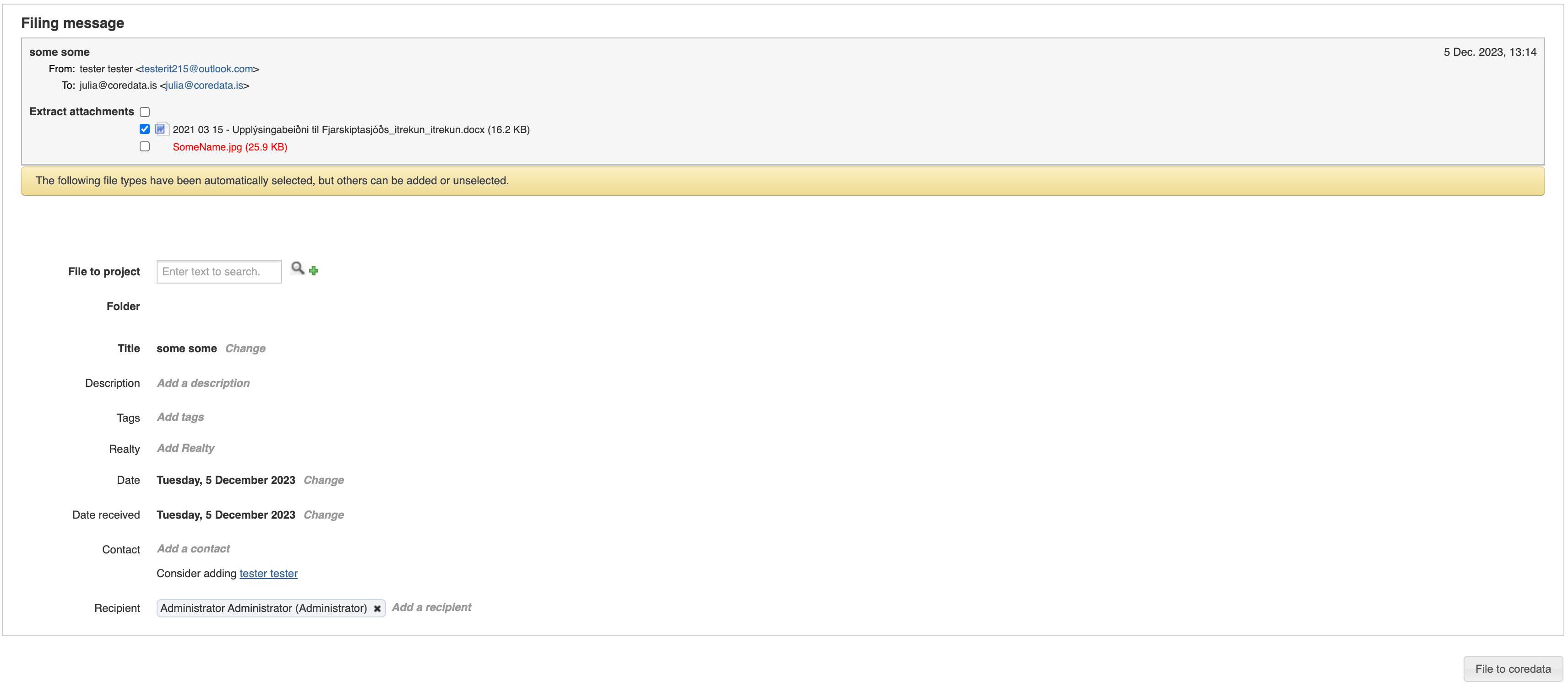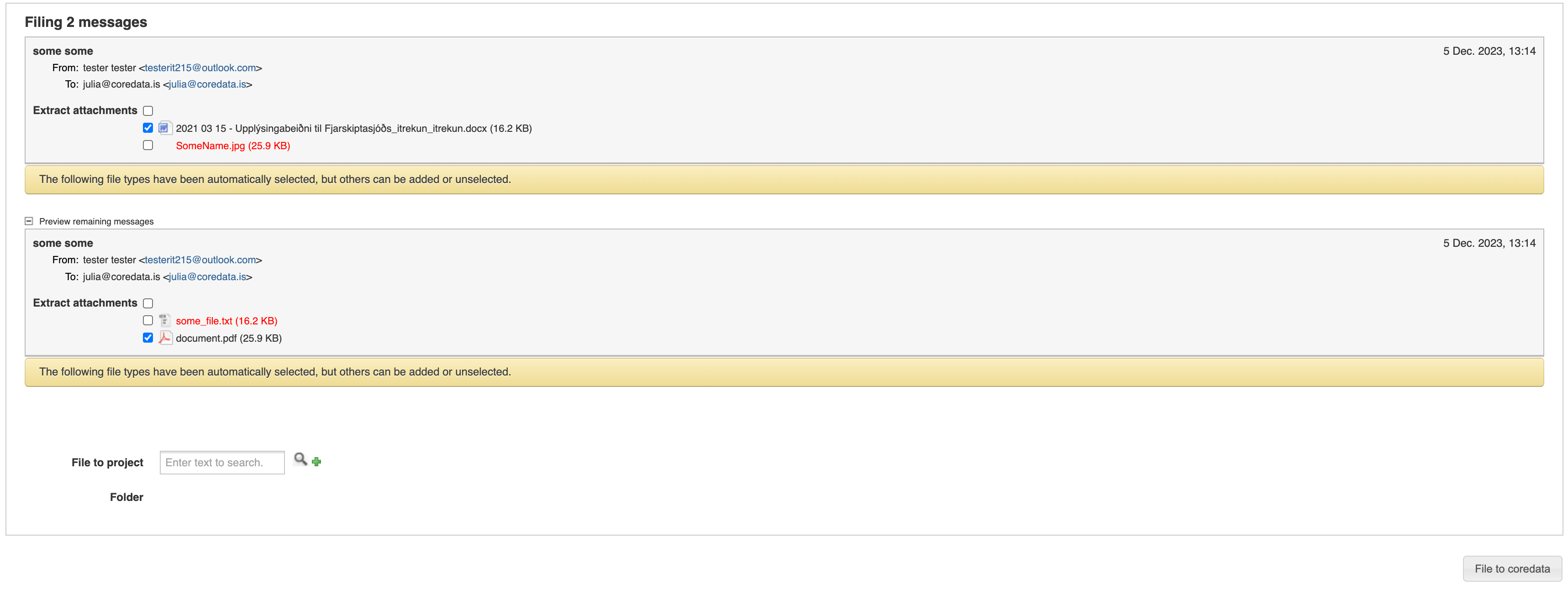 Verið er í samvinnu við viðskiptavini að tryggja sem besta skráningu á tölvupóstum og viðhengjum þeirra. Nú eru algengustu skráarsnið valin sjálfgefin til að vistast inn í verkefni þegar skjal er “sent til CoreData”. Þau viðengi sem ekki eru valin sjálfgefið fá rauðan afgerandi lit til að kalla fram viðbrögð notandans við því að taka afstöðu til þeirra viðhengja sem á að afrita í verkefnið og hver ekki. Notandi getur valið öll viðhengi eða ekkert eftir því hver krafa fyrirtækisins er.