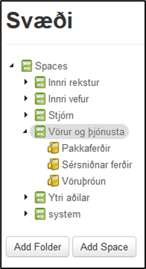 Aðgerðahnappar (fyrir neðan möppu-tréð) breytast eftir því hvort smellt er á yfirsvæði (e. folder) eða svæði (e. space) í yfitlitinu.