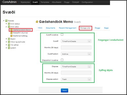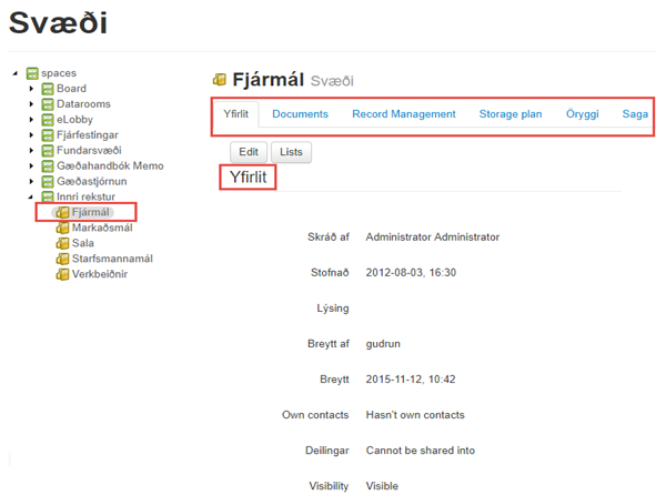 Þegar smellt er á svæði (space) þá birtast flipar sem ýmist veita upplýsingar yfir hvaða skjöl svæðið inniheldur, hvaða hópar hafa réttindi, geymsluskrá (e.storage plan) og sögu eða innihalda aðgerðir til að setja eigindi t.d. aðgangstakmarkanir eða grisjun á svæðið.