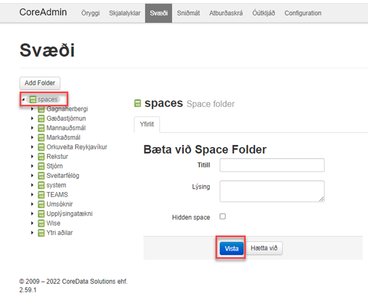 Smelltu á rót (e. default domain/efsta svæðið) til þess að búa til yfirsvæði og því næst á Add Folder. Síða til þess að skilgreina yfirsvæði opnast. Skrifaðu heiti á yfirsvæðinu auk lýsingar ef þörf er á. Hægt er að láta lýsingu birtast notendamegin með því að haka í Show space description in CoreData.