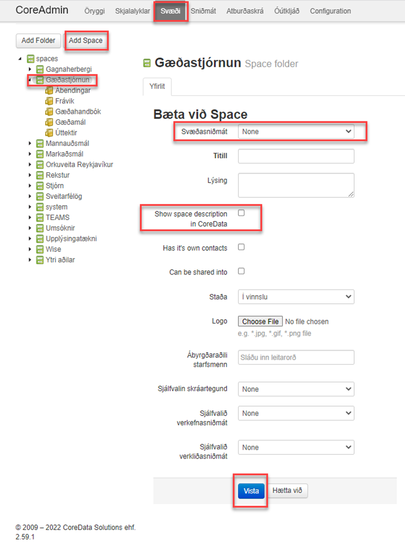 Smelltu því næst á Save til að vista.Ef svæðið á að vera skráarsvæði (e. filespace) þarf að velja það í Svæðasniðmát.