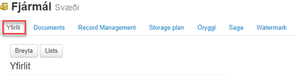 Þegar smellt er á tiltekið svæði eða við vistun á nýju svæði þá opnast yfirlitssíða þess. Á yfirlitsíðunni er hnappur til þess að breyta grunnupplýsingum um svæðið. Sjá nánar í Búa til yfirsvæði ( folder) og svæði (space) og Skilgreining á eigindum svæða.
