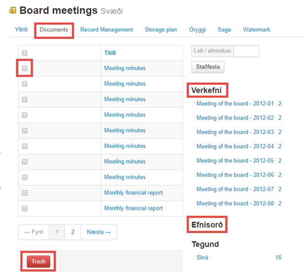 Til að eyða skjölum af svæði þarf að haka við skjöl og smella á Trash / Ruslatunna.