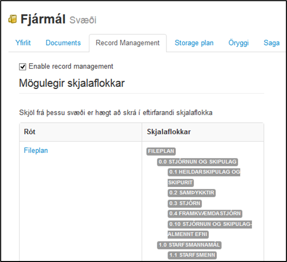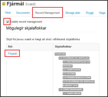 Smelltu á flipann Record Management og hakaðu við Enable record management til þess að virkja notkun skjalalykla á svæðinu sem verið að vinna með.