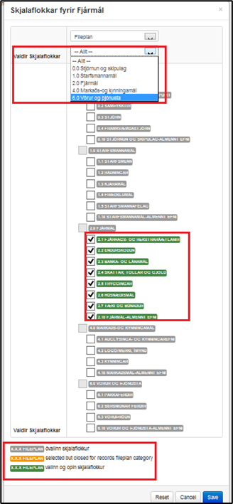 Með því að haka við ákveðna flokka er hægt að velja hvaða flokkar verða sýnilegir fyrir hvert svæði. Litakóðun segir til um skilgreiningu á flokkum. Til að taka af alla skjalaflokka í einu er hægt að smella á Reset / Hreinsa neðst á síðunni.