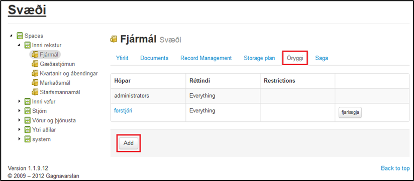Ávallt þarf að gefa notendahópum/notendum réttindi að svæðum svo þau sjái skjöl og verkefni sem eru vistuð undir því.