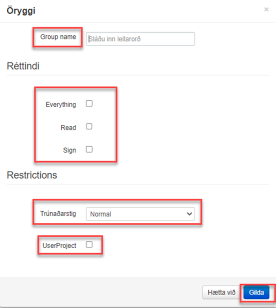 Sign ef notendahópurinn á að geta undirritað skjöl á svæðinu.Trúnaðarstig skjala – skilgreinir hvaða trúnaðarstig aðgangshópurinn hefur. Þegar skjöl eru sett á svæðið er hægt að skilgreina trúnaðarskjöl þeirra og þá sjá t.d. þeir sem eru með trúnaðarstigið „normal“ ekki skjöl á svæðinu sem eru með trúnaðarstigið „sensitive“ eða „very sensitive“.