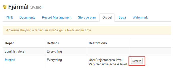 Til þess að fjarlægja réttindi að svæði þarf að smella á Remove fyrir aftan nafn hópsins á yfirlitsíðunni.