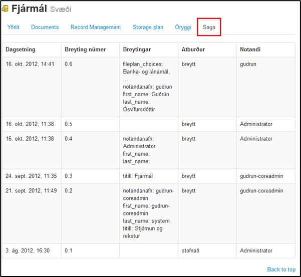 Allar breytingar sem eru gerðar á svæðum eru skráðar og birtar í atburðaskrá undir flipanum Saga.