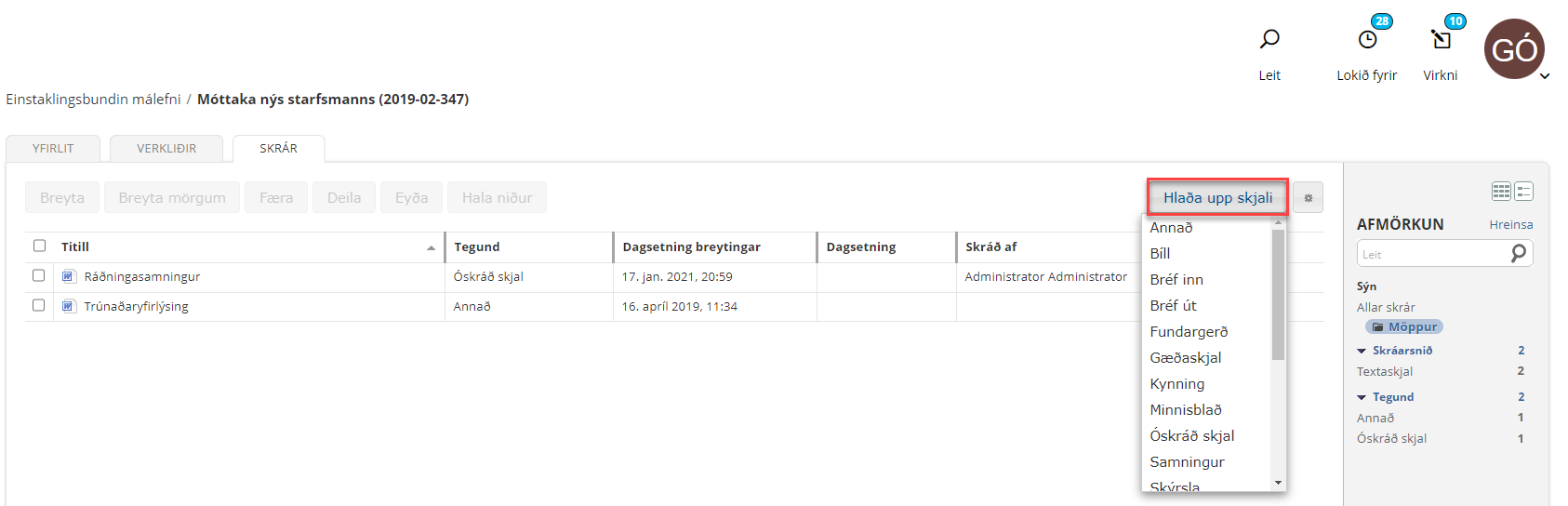 Skjalategund kemur einnig sjálfkrafa sem skjalategund póstsins en hægt er að breyta því með því að velja nýja skjalategund efst í glugganum.
