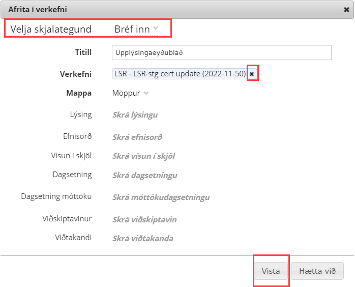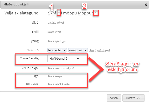 Öll skjöl eru vistuð með skjalategund. Sjálfgefna skjalategundin er Skrá en mögulegt er að breyta því. Efst í skráningarglugganum er hægt að breyta tegund skjals með því að smella á litlu píluna (1) sem bendir niður á eftir Skrá. Fyrir ákveðnar skjalategundir bætast við ný skráningarsvæði í gluggann, svo sem dagsetning og höfundur. Ef búnar hafa verið til undirmöppur er hægt að láta skjal vistast beint í möppu, með því að smella á litlu örina sem bendir niður á eftir Möppur (2).