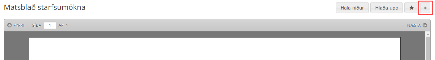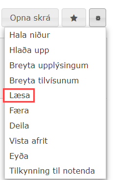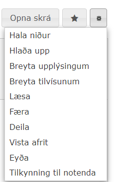 Sýn á skjal er mismunandi eftir því hvaða vafri er notaður og hvort CoreData Desktop er virkt eða ekki. Þegar skjal hefur verið valið er hægt að smella á Tannhjólið og þar er boðið upp á nokkrar aðgerðir.