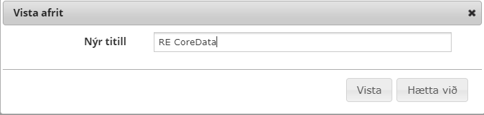 Hægt er að afrita skjal með einföldum hætti í CoreData. Það er gert með því að smella á tannjólið og velja aðgerðina Vista afrit. Þá birtist glugginn þar sem titill á afritinu er sleginn inn (sjá hér fyrir neðan). CoreData sér um að gefa skjalinu rétta endingu t.d. fær Word skjal sjálfkrafa .doc eða .docx endingu. Þegar smellt er á Vista er skjalið afritað. Nýja afritaða skjalið birtist á skjánum og hægt að hefja vinnu í því. Nýja skjalið er staðsett í sömu möppu og upphaflega skjalið.