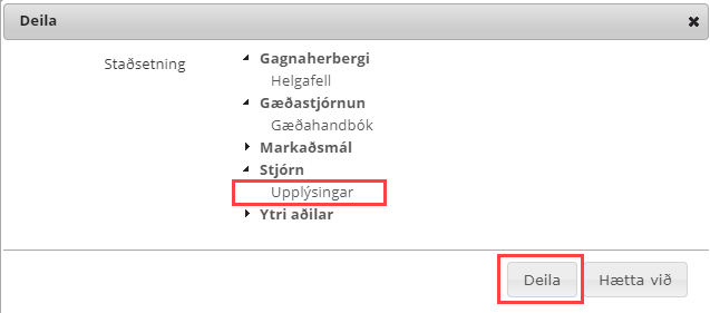 Skjali er deilt með því að opna skjalið í sýnishorni og smella á tannhjólið. Veljið aðgerðina Deila og þá opnast gluggi með lista yfir þau skjalasvæði þar sem mögulegt er að deila skjölum.