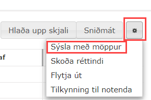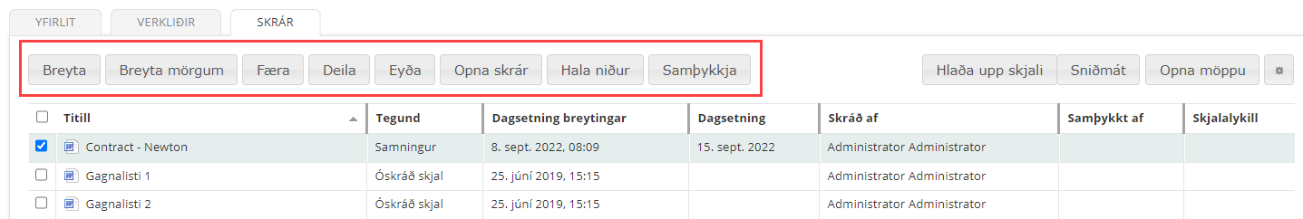 Það er gert með því að haka í reitinn framan við skjölin og smella síðan á viðkomandi aðgerð.