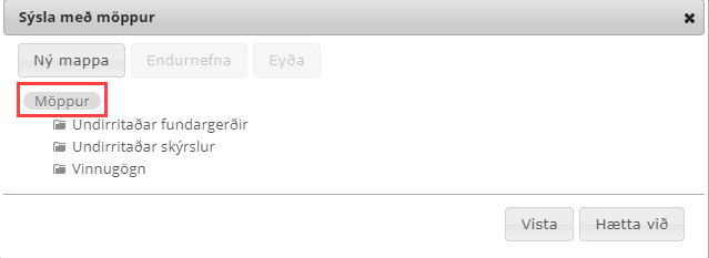 Ef stofna á undirmöppu þá þarf að velja viðeigandi möppu (sem verður þá yfirmappa – dæmi mappan Vinnugögn á myndinni hér fyrir ofan).