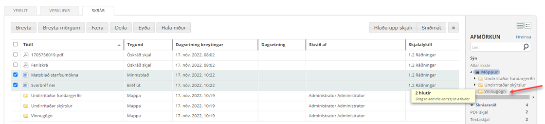 Til að færa skrá yfir í möppu er hægt að setja bendil yfir skrá og halda músarhnappnum niðri. Ef flytja á fleiri en eina skrá er hakað í allar skrár sem á að færa.