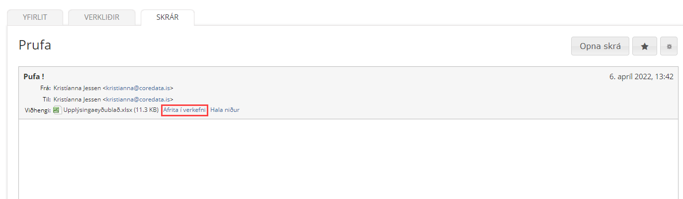 Hægt er að vista viðhengi úr tölvupósti inni í verkefni/mál. Það er gert með því að smella á tölvupóstinn í CoreData og smella á Afrita í verkefni. Einnig er hægt að hala viðhenginu niður beint í tölvuna (Tannhjól > Hala niður).