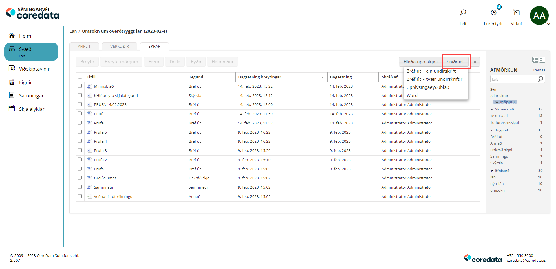 Hægt er að bæta nýju skjali við með því að smella á Hlaða upp skjali (sjá nánar hér fyrir ofan). Ef nota á skjalasniðmát sem búið er að skrá í CoreAdmin er valið Sniðmát og opnast þá skráningargluggi sambærilegur og lýst er þegar nýju skjali er hlaðið upp.
