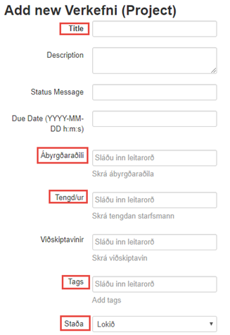 Skráningarformin eru eins fyrir Section og Task svo gæta þarf að velja rétt í byrjun. Eins og áður þarf að fylla út titil og lýsingu ef þörf er á og stilla status fyrir upphafsstöðu verkliðs.