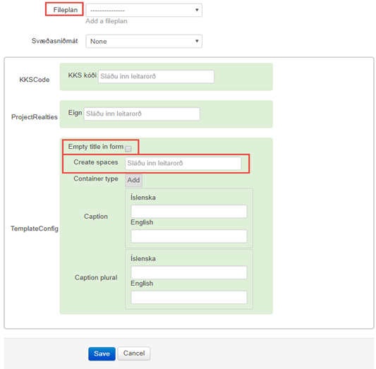 Skjalasniðmát skilgreint fyrir ákveðin svæði. Ef skjalasniðmát á ekki að sjást á öllum svæðum skal skrá svæði í Create spaces. Hægt er að skrá mörg svæði.