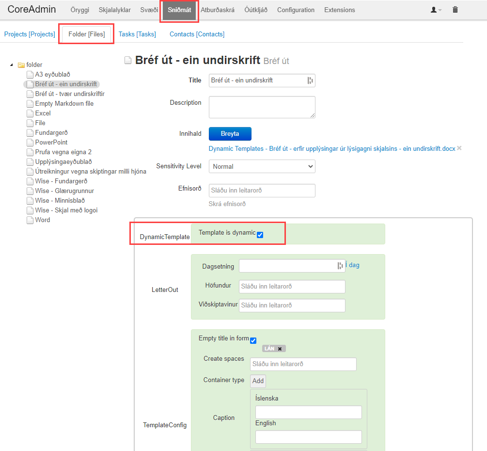 Dynamic templates er viðbót sem hægt er að kveikja á fyrir viðskiptavini og nýta til dæmis til að gera sniðmát að útsendum bréfum. Sniðmátin eru búin til í CoreAdmin eins og venjuleg skjalasniðmát en haka þarf í Template is dynamic til að lýsigögn erfist. Skjalið sjálft þarf hins vegar að innihalda upplýsingar til að draga fram það sem við viljum sjá í skjalasniðmátinu: