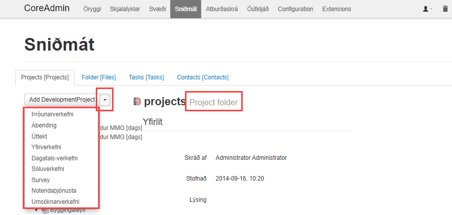 Fyrst þarf að velja verkefnagrunn sem verkefnasniðmátið á að byggja á. Verkefnagrunnar birtast þegar smellt er á örina og geta haft t.d. mismunandi stöður á verkefnum sem stofnuð eru á grunninum. Alltaf er hægt að sjá á hvaða verkefnagrunni verkefnasniðmát er stofnað (ljósgrátt við hliðina á heiti sniðmáts):