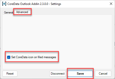Þar er hakað við Set CoreData icon on filed messages og smellt á Save.