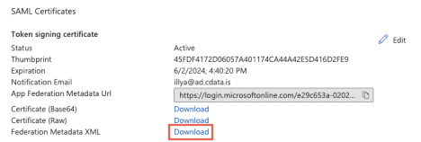In SAML Certificates download the metadata XML. It Contains Azure public certificates. Remember that from time to time they expire. In case of any issues with SSO - please try donwloading new version from Azure and re-upload to CoreData as shown later in this guide: