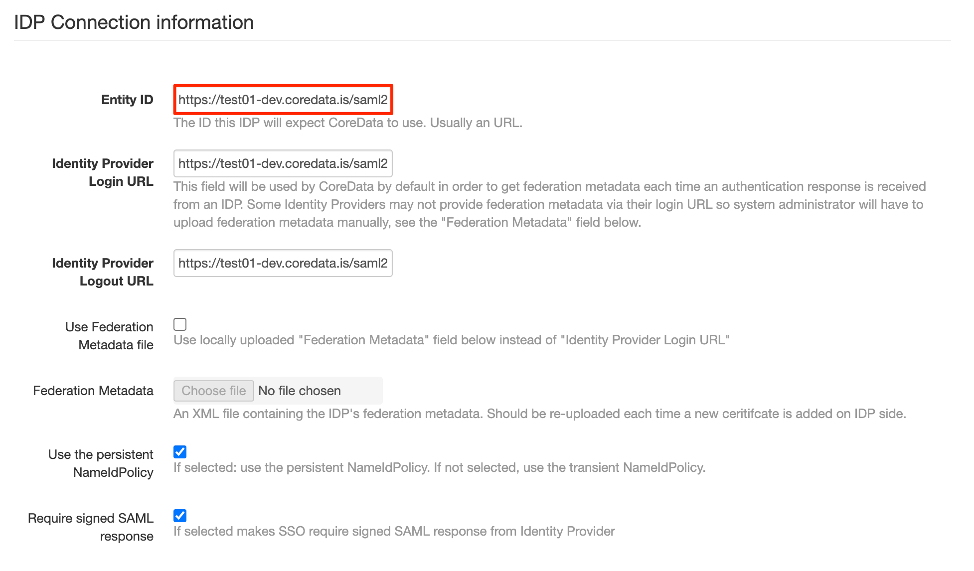 Please pay ATTENTION to the slash symbol at the end - it’s important: “/”.CODEhttps://test01-dev.coredata.is/saml2/metadata/Identity Provider Login URL