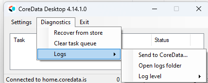 Þá opnast þessi gluggi og þar er smellt á Logs > Send to CoreData…: