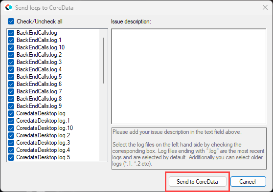 Ef senda þarf logga til CoreData til skoðunar þá er farið í litlu örina neðst hægra megin á skjánum og þar smellt á CoreData logoið.