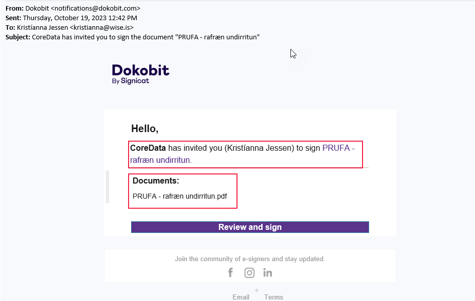Texti sem áður var í tölvupósti vegna undirritunar dettur út og textinn er núna í grunninn sá sami hjá öllum en þar kemur fram frá hvaða CoreData viðskiptavin skjalið var sent, nafn þess sem á að undirrita og heiti skjalsins sem undirrita á. Sjá mynd hér fyrir neðan.