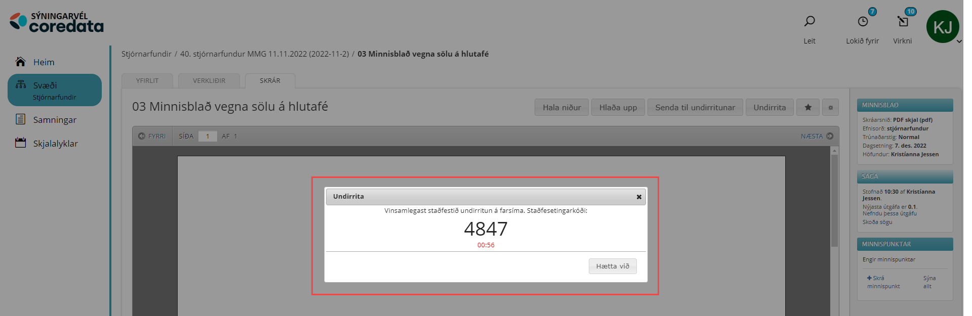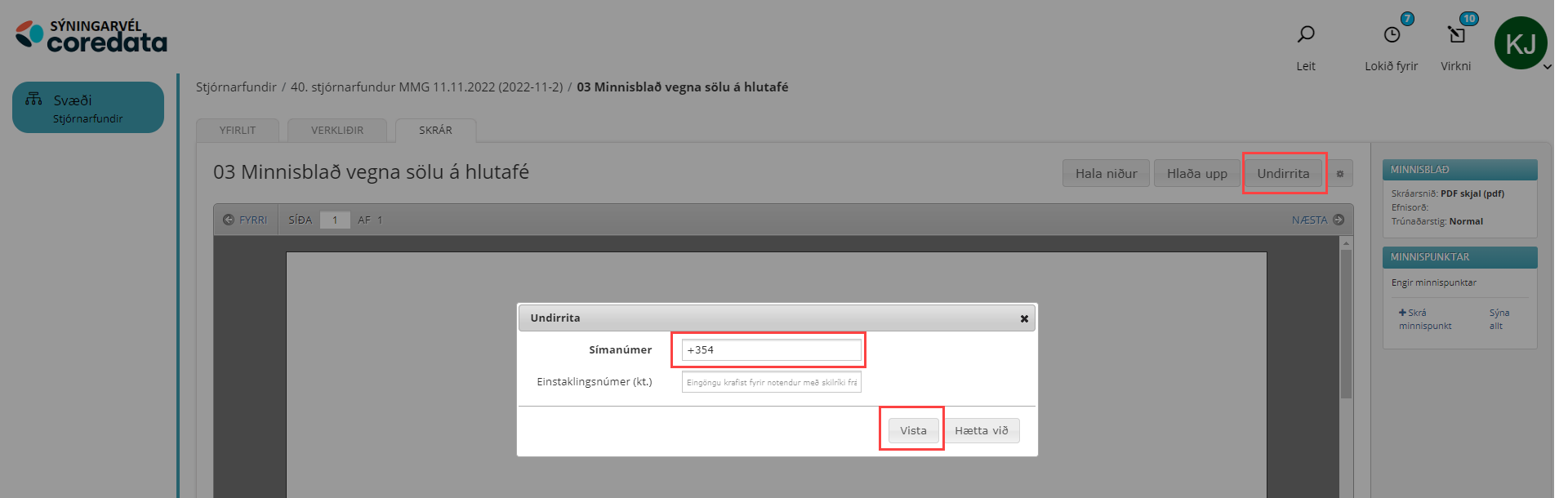 Til að nota þessa virkni þarf sá sem á að undirrita að vera skráður notandi í CoreData.