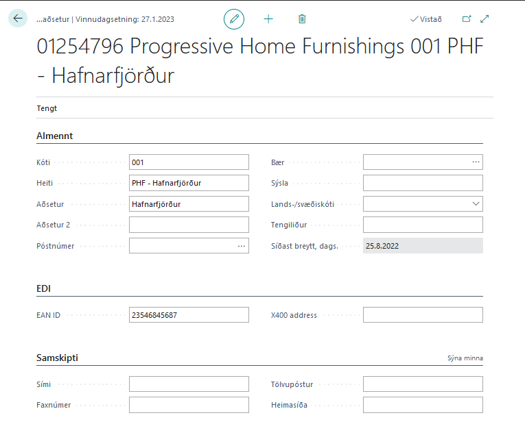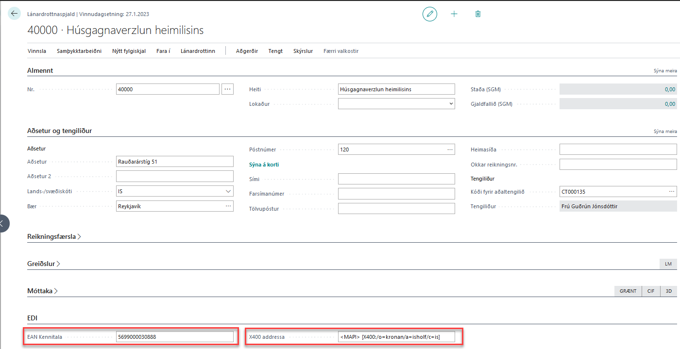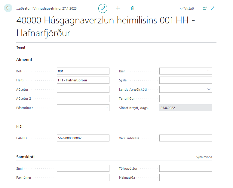 Upplýsingar um EAN kennitölu eru skráðar undir pöntunaraðsetur, ef verslun hefur mismunandi afgreiðslustöðvar. Pöntunaraðsetur er að finna undir lánardrottnaspjaldinu.