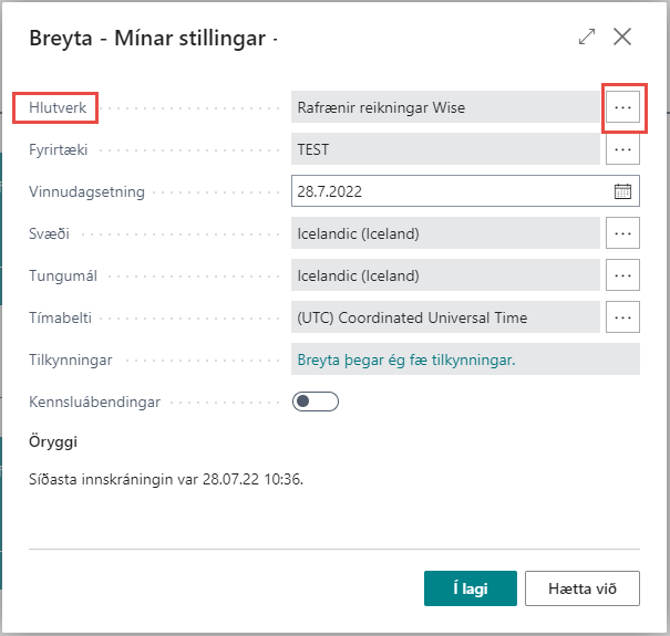 Hlutverk sem hægt er að velja um eru m.a. Bókari, Aðalbókari og Rafrænir reikningar Wise o.fl. Fer allt eftir því hvaða hlutverk verið er að vinna hverju sinni. Einnig er hægt að velja eitthvert af þeim fyrirtækjum sem stofnuð hafa verið í kerfinu. Með því að velja hlutverkið Rafrænir reikningar má finna allt það helsta sem er notað í Rafrænar sendingar þ. á. m. allt fyrir kerfiseininguna RSM pantanir.
