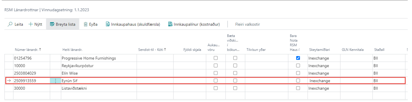 Einungis er hægt að senda rafrænar pantanir á lánardrottna sem styðjast við tækniforskriftina sem gefin er út af Staðlaráði Íslands. Til þess að senda rafrænan reikning þarf að stofna lánardrottinn sem RSM lánardrottinn. Hér er kennitala lánardrottins fundin út frá lánardrottnatöflunni. Ef sjálfgefin skeytamiðlari og staðall er settur upp í RSM grunni eiga þær upplýsingar að koma sjálfkrafa hér.
