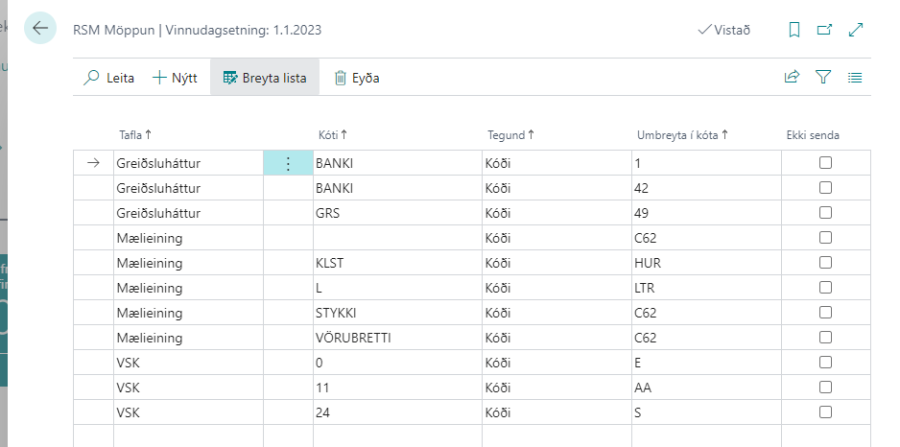 Mikilvægt er að allar mælieiningar sem verið er að nota séu rétt varpaðar. Fyrirfram ákveðnir kótar eru svo notaðir til að mappa mælieiningarnar. Með því að nota þessa kótatöflu er verið að fylgja kótatöflu UN/ECE. Hér fyrir neðan má sjá lista yfir helstu mælieiningar. Athugið að hér eru bara mælieiningar, ekki pakkningar líkt og tunna, kassi. Ef notaðar eru slíkar mælieiningar er hægt að nota kótann C62 sem þýðir einn.