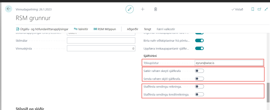Senda rafræn skjöl sjálfkrafa | Ef hakað er í reitinn þá mun verköðin senda alla reikninga. |