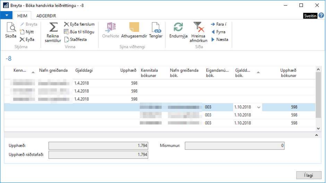 Þegar búið er að framkvæma þetta fyrir allar færslurnar þá er hægt að halda áfram með álagningarferlið og gjaldfella á viðskiptamenn.