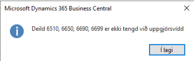 Fara svo aftur í Stofna uppgjörsfærslur og þá ætti keyrslan að klárast. Tími keyrslunnar fer eftir stærð sveitarfélagsins. Þegar keyrslan klára ætti að sjást staða fyrir uppgjörið. Staða til dags og Hreyfing ársins á að vera 0 eða því sem næst. Áætlunartölurnar eru summan á bæði rekstrar og efnahagsáætlunum, þannig þær stemma ekkert endilega við áætlaða rekstrarniðurstöðu.
