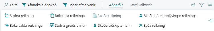 Skoða reikning | Ef búið er að stofna reikning eða bóka reikning þá er hægt að skoða hann með aðgerðinni Skoða reikning. |