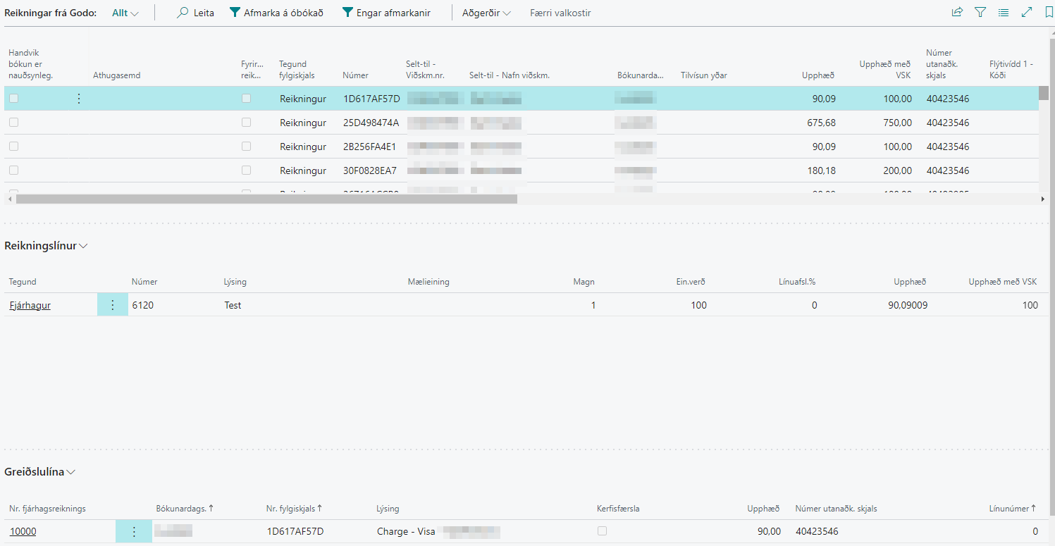 Þegar þessi síða er opnuð koma upp allir óbókaðir reikningar sem borist hafa frá Godo hótelkerfinu.