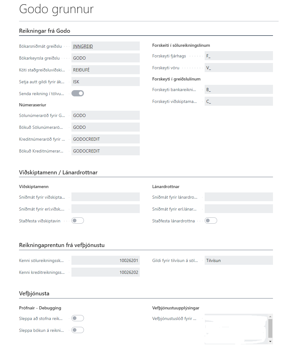 Forskeyti fjárhags | Tilgreinir forskeyti fyrir fjárhagsreikninga fyrir færslur frá Godo. Kerfið notar forskeytið til að vita að færslan bókist á fjárhagslykil. |